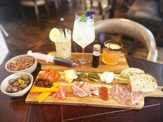 3 zombie-inspired cocktails- The Infected, Patient Zero and The Quarantine Zone. Cheese and charcuterie sharing board, house pickles, olives, nuts and sourdough